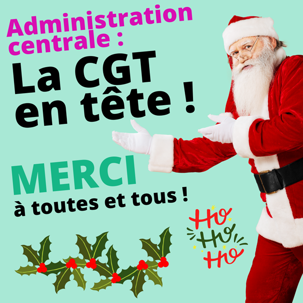 En 2022 comme en 2018 et 2014, vous avez placé la CGT en tête des élections professionnelles à l’administration centrale. Merci ! La CGT est fière de porter vos voix ! Nous vous remercions de votre confiance et espérons vous retrouvez en 2023 avec nous et le père noël pour se mobiliser pour de nouveaux droits, une société plus juste et une administration centrale qui relève la tête ! Nos bonnes résolutions 2023 et notre (non) liste au père Noël sont à lire en PJ avec une première analyse des résultats. Avec une progression de de 166 voix et 4 points par rapport à 2018, la CGT s’affiche sans équivoque comme la première organisation de l’administration centrale et gagne un siège supplémentaire au CSA. Elle est la seule organisation à être présente sur l’ensemble des CAP de l’administration centrale ce qui confirme notre succès et notre ancrage dans l’ensemble des corps de métiers et catégories de personnels.