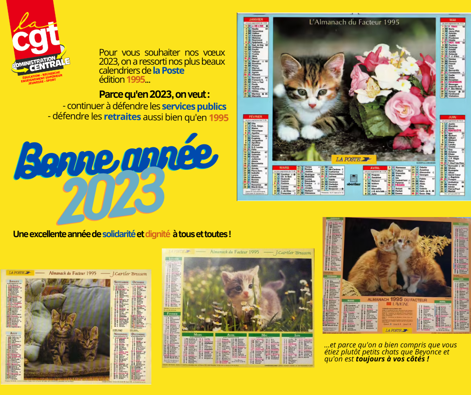La CGT vous présente ses meilleurs vœux pour l’année 2023, des vœux de lutte dans ce contexte de réforme annoncée du système des retraites mais surtout des vœux de solidarité et de dignité !