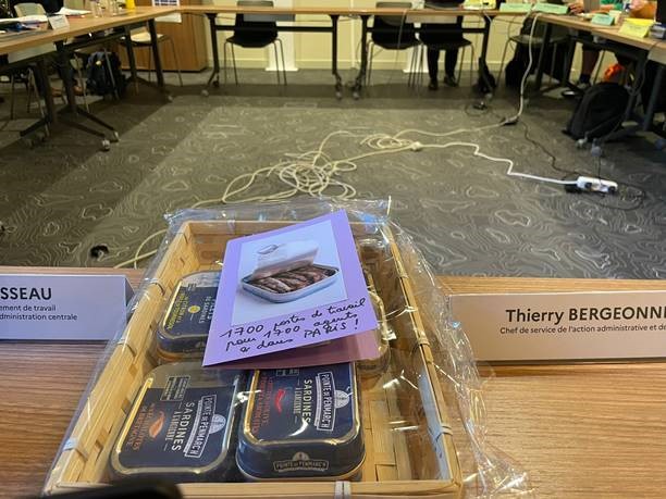 Pour marquer le coup et pour symboliser le resserrement généralisé des agents envisagé dans le site unique, l’intersyndicale a offert au secrétaire général un panier de boîtes de sardines. Nous revendiquons 1700 postes de travail pour 1700 agents dans Paris !